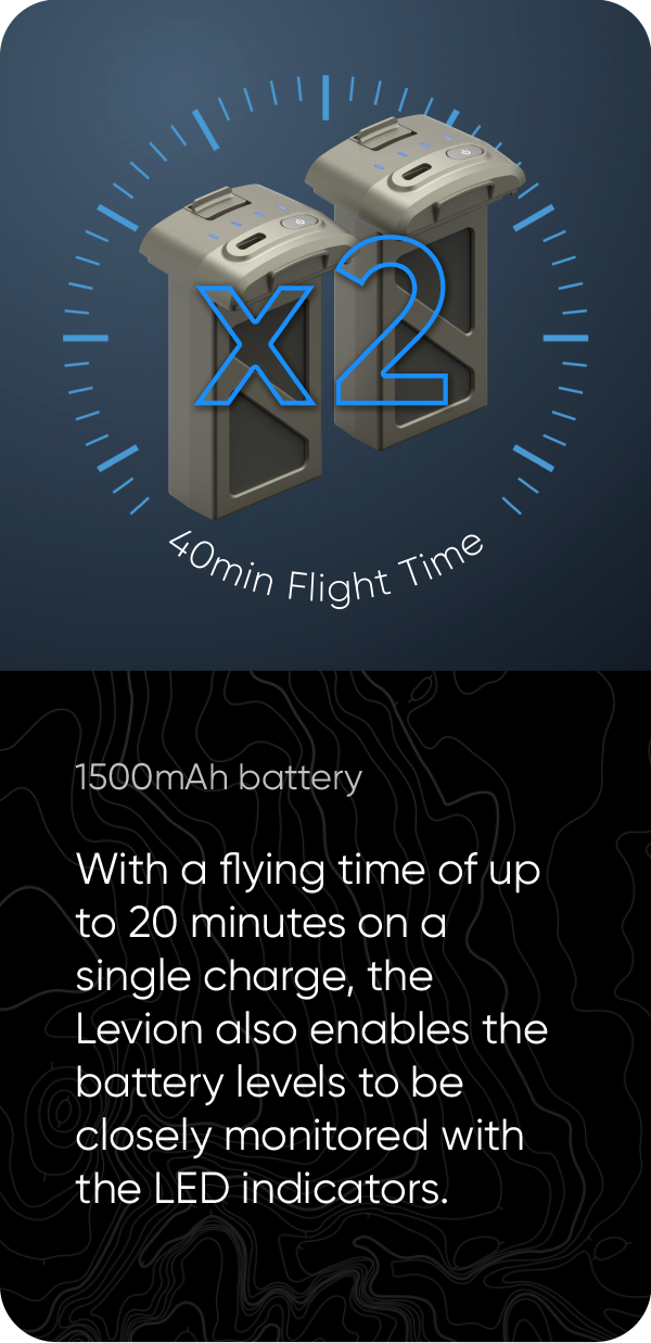 Supplied with two 1500mAh drone batteries, the Levion can fly longer and further with a shorter downtime and extended flying fun