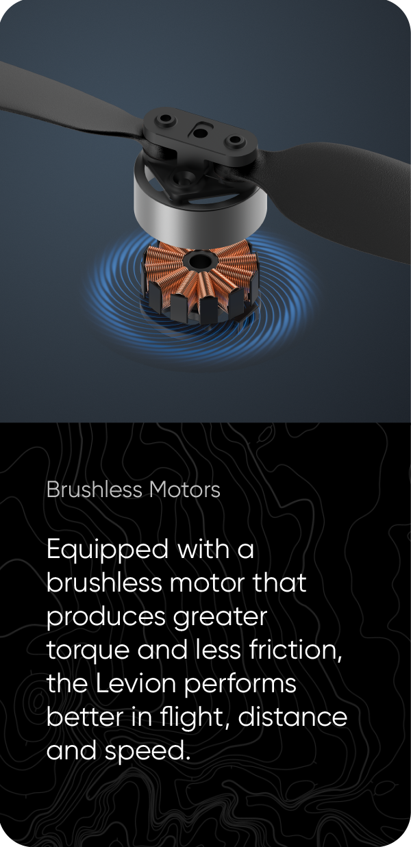 Equipped with brushless motors that produce greater torque and less friction, the Levion performs better in flight, distance and speed.