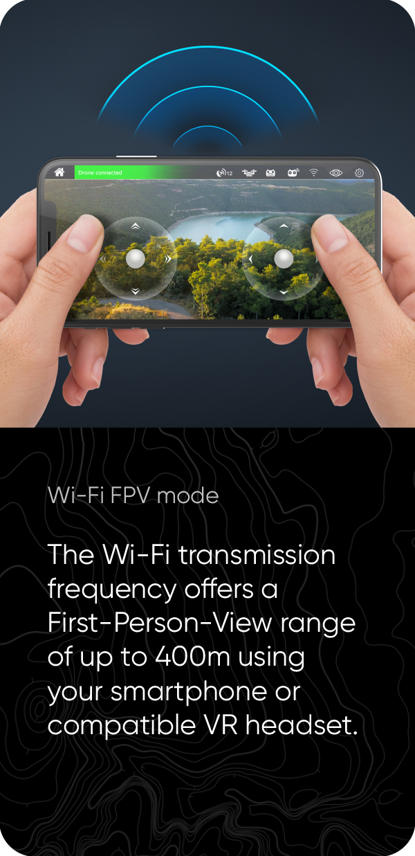The Wi-Fi transmission frequency offers a First-Person-View range of up to 300m using your smartphone or compatible VR headset.