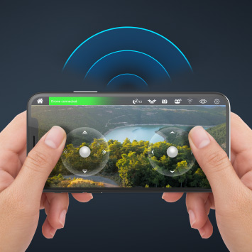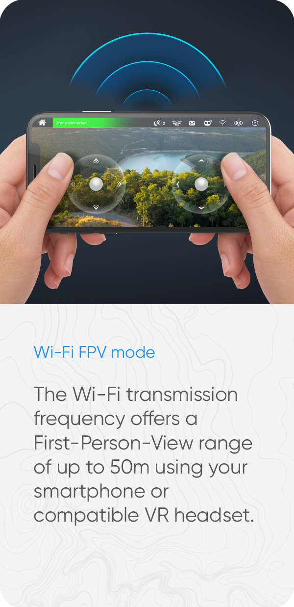 The Wi-Fi transmission frequency offers a First-Person-View range of up to 50m using your smartphone or compatible VR headset.