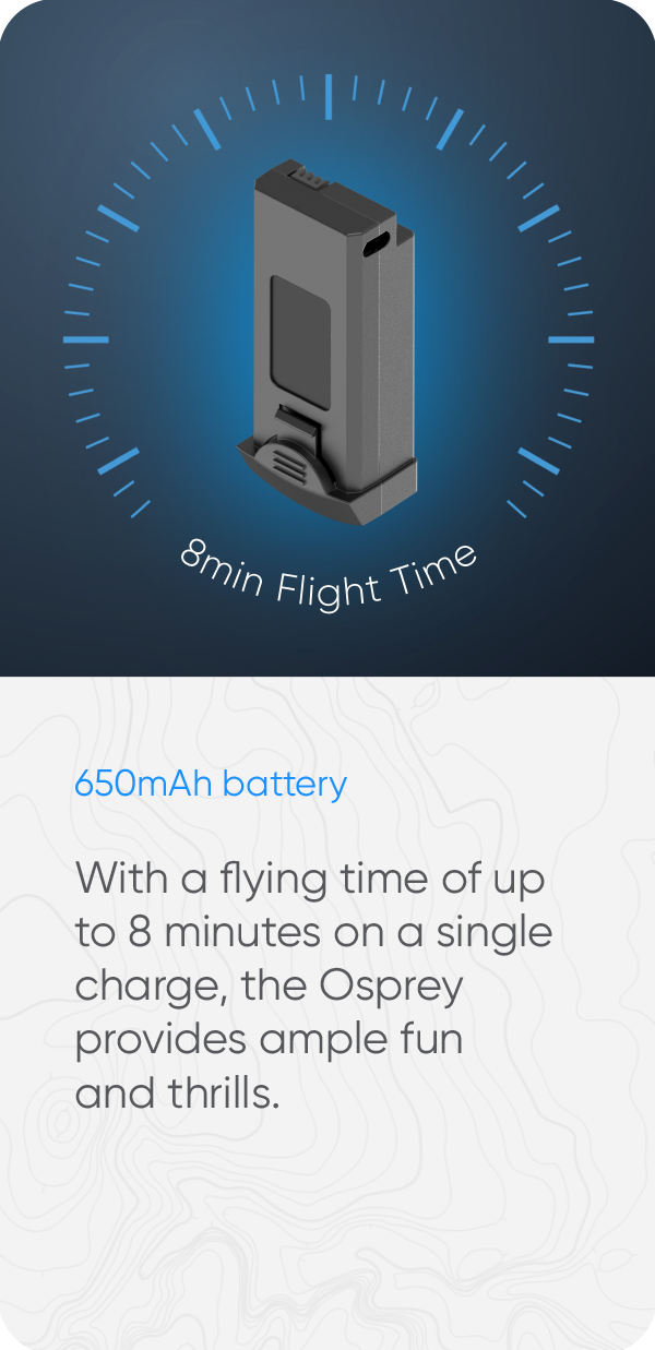 With a flying time of up to 8 minutes on a single charge, the Osprey provides ample fun and thrills.