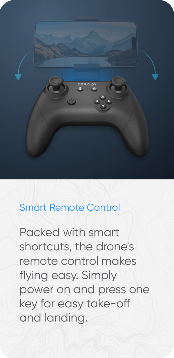 Packed with smart shortcuts, the drone's remote control makes flying easy. Simply power on and press one key for easy take-off and landing.