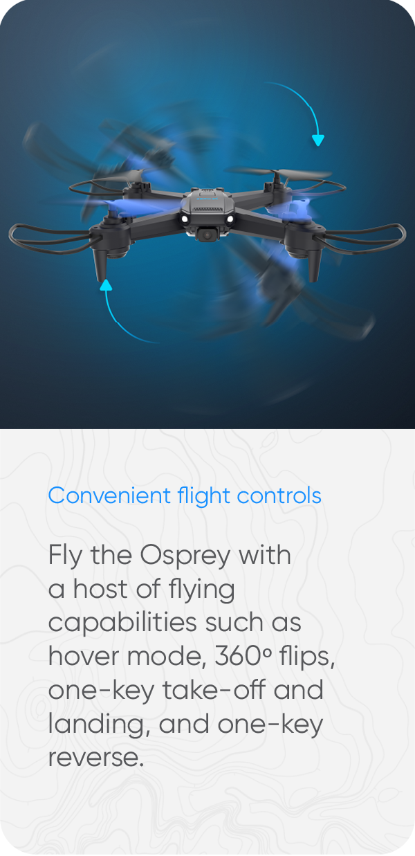 Fly the Osprey with a host of flying capabilities such as hover mode, 360º flips, one-key take-off and landing, and one-key reverse.