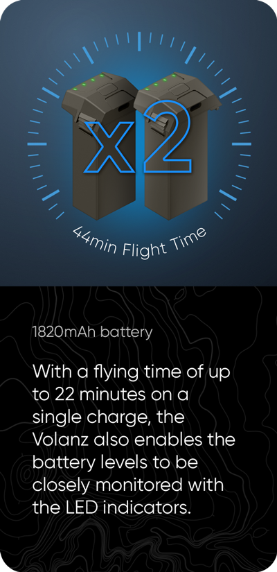 Supplied with two 1820mAh drone batteries, the Volanz can fly longer and further with a shorter downtime and extended flying fun
