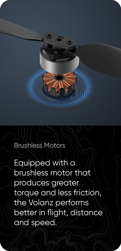 Equipped with brushless motors that produce greater torque and less friction, the Volanz performs better in flight, distance and speed.